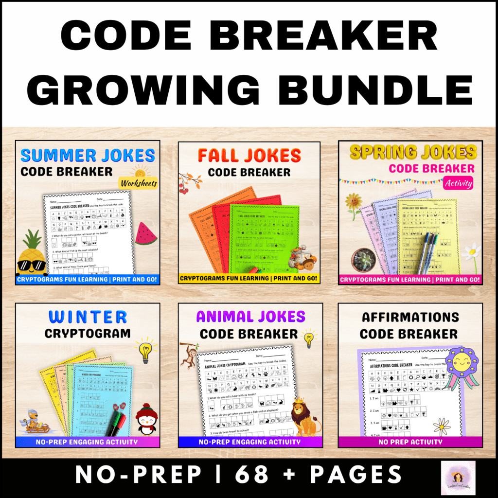 This bundle includes fun, themed codebreaker puzzles for every season and celebration throughout the school year. You’ll find engaging sets like spring jokes, summer jokes, summer words, fall jokes, winter jokes, and winter-themed vocabulary. It also covers special occasions such as New Year jokes, Earth Day, and important figures like Martin Luther King Jr., Marie Curie, and Maya Angelou—perfect for holidays and heritage months. Additional sets include back-to-school trivia, school supplies, and school jokes, along with weather jokes, growth mindset messages, positive affirmations, animal jokes, planet facts, shark fun facts, and two sets of fun riddles ideal for back-to-school or end-of-year activities.