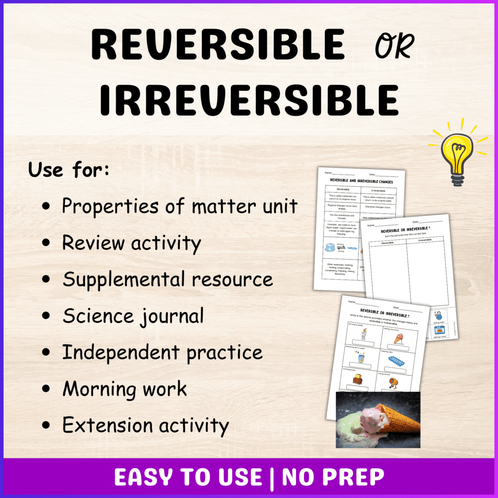 Teaching reversible and irreversible changes is a fantastic way to connect science to your students’ everyday experiences. This topic, perfect for grades 2-5, helps students see how some changes—like melting ice—can be reversed, while others—like burning paper—are permanent. Encourage your students to observe, ask questions, and consider why some changes are reversible while others are not. If you’re searching for creative ways to bring this lesson to life, I’ve gathered practical tips and activities in this blog. With these ideas and a helpful resource, you’ll make this concept both memorable and enjoyable for your students.